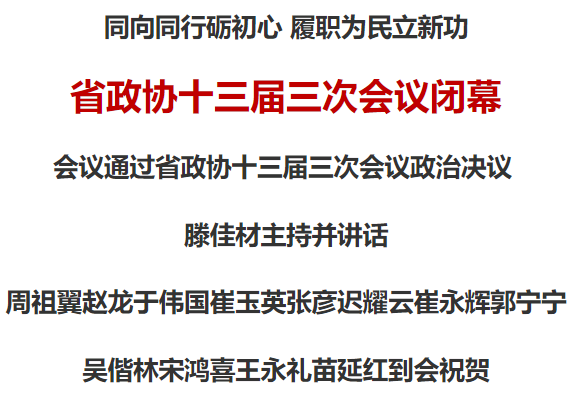 16日上午,省政協十三屆三次會議圓滿完成各項議程,在福州閉幕。 大會執行主席滕佳材、黃海昆、張兆民、黃文輝、王光遠、阮詩瑋、劉獻祥、嚴可仕、余軍、張國旺、黃玲、黃如欣、邱天華在主席臺前排就座。 省委書記、省人大常委會主任周祖翼,省委副書記、省長趙龍,全國人大、全國政協專委會領導于偉國、崔玉英,省領導張彥、遲耀云、崔永輝、郭寧寧、吳偕林、宋鴻喜、王永禮、苗延紅到會祝賀。 滕佳材主持會議并講話。他說,這次全會是在“十四五”規劃收官之年、新時代新福建建設關鍵時刻召開的一次重要會議,省委高度重視,委員熱情參與,社會持續關注。周祖翼書記、趙龍省長等領導同志出席開幕會和閉幕會,聽取大會發言,參加小組和聯組討論,會見港澳臺僑人士,共商新福建建設大計、共謀高質量發展良策。省委、省人大常委會、省政府、省兩院、駐閩部隊的領導和省級老同志,以及省直有關部門、社會有關方面給予了大力支持。廣大委員以飽滿的政治熱情、強烈的責任擔當、昂揚的精神狀態,認真審議和討論各項報告,并通過反映社情民意信息、提交提案、分組討論等形式,踴躍發言、積極建言,提出了許多有深度、高質量、接地氣的真知灼見,充分展現了胸懷大局、情系民生的履職風采。 滕佳材指出,站在“兩個大局”同步交織、兩個“五年規劃”相互交接的新起點上,我們對共同創造的歷史豪情滿懷,對開創未來的征程信心百倍。全省各級政協組織、政協各參加單位和全體政協委員要旗幟鮮明講政治,始終堅持用習近平新時代中國特色社會主義思想明德修身,以高尚人格感染人、模范行為引導人、獨特魅力凝聚人,以實際行動堅定擁護“兩個確立”,堅決做到“兩個維護”。要協商資政見水平,始終秉承人民政協的優良傳統,善謀穩中求進實招、勇探奮勇爭先新路、多獻高質量發展良策,持續打造“協商”品牌、強化“監督”力量、彰顯“專門”優勢。要履職為民礪初心,始終牢記政協前面的“人民”二字,把民生“頭等大事”協商深,把群眾“關鍵小事”商量好,以扎扎實實的履職實效反映心聲、回饋民聲、贏得掌聲,以為閩協商、為民服務的使命擔當,奮力開創我省政協事業新局面,在新時代新福建建設的火熱實踐中再創佳績、再展風采。 滕佳材說,大道如砥,大勢如潮。崇高的使命召喚我們奮勇爭先,壯闊的前景激勵我們接續奮斗。讓我們更加緊密地團結在以習近平同志為核心的中共中央周圍,高舉習近平新時代中國特色社會主義思想偉大旗幟,在中共福建省委領導下,同向同行、群策群力,為奮力譜寫中國式現代化福建篇章作出更大貢獻!